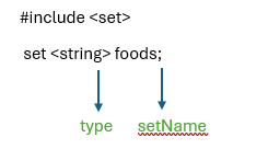 set<string> foods = {“Idly”, “Vadai”, “Pongal”, “Dosa”};