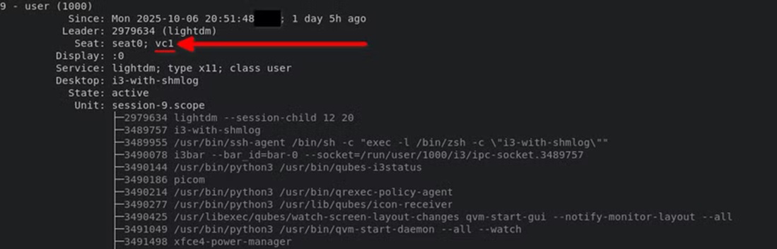 உள்நுழைவு அமர்வு எந்த மெய்நிகர் பணியகத்துடன் இணைக்கப்பட்டுள்ளது என்பதைகாண பின்வரும் கட்டளையைப் பயன்படுத்திகொள்க.